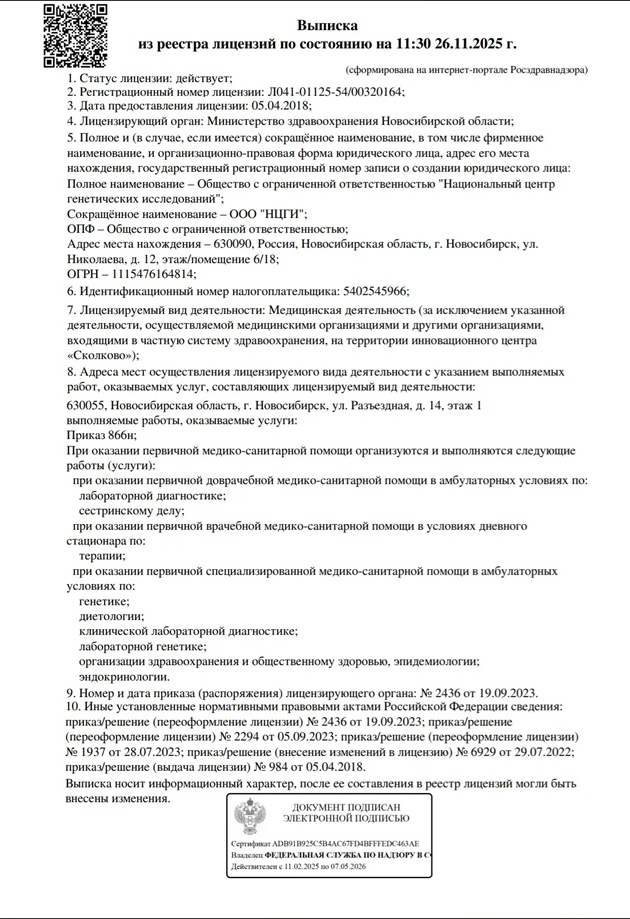Молекулярно-генетический центр «ДТЛ» является официальным представителем лаборатории ООО «ИнЛаб Генетикс» («InLab Genetics») в Ак-Довураке. Все ДНК тесты проводятся на основании медицинской лицензии: № Л0-41-01148-78/00644845 от 23.03.2023 г..